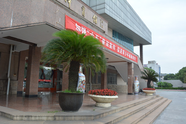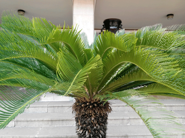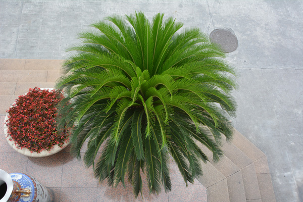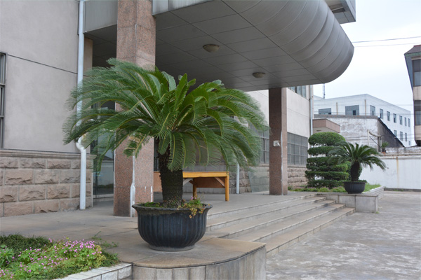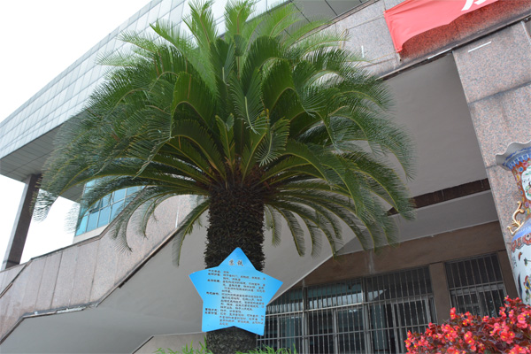 前黄实验学校景观树木品种多样,苏铁在其中占有重要的地位,分别在攀登楼、体育馆等场馆门厅前两侧成对放置,是建筑物门面的重要点缀,也是主大道景观的重要组成部分。这些铁树中的多数已有数十年树龄,在花木工的精心培植下,六棵在往年已有过开花经历,今年开花的六棵中有两棵是首次开花。