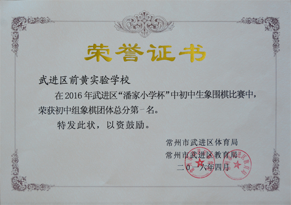 近日,2016年武进区“潘家小学杯”中小学生象围棋比赛在潘家小学隆重举行。全区共有18支代表队243名运动员参加了本次象围棋比赛,我校学生积极参加,经过一天紧张的角逐,最终,荣获初中组象棋团体总分第一名,围棋团体总分第二名。